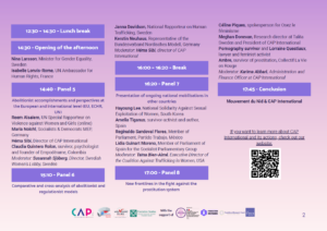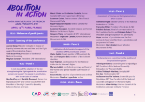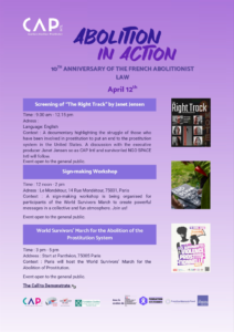 Nos dias 12, 13 e 14 de abril de 2026, a CAP International, em conjunto com os seus membros franceses Mouvement du Nid e Fondation Scelles, e com o apoio de 20 organizações feministas abolicionistas francesas do Coletivo Abolicionista, organiza em Paris três dias de eventos para assinalar e celebrar os 10 anos da lei abolicionista francesa.