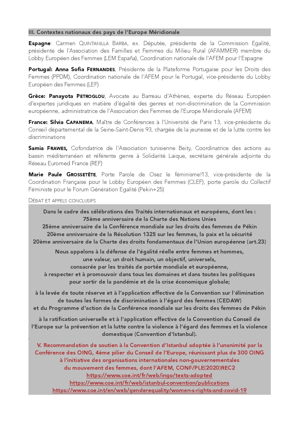 – Conseil de l’Europe, “Recommandation de soutien à la Convention d’Istanbul” adoptée par la Conférence des Organisations Internationales Non-gouvernementales (OING), 3ème pilier du Conseil de l’Europe réunie en session plénière le 15 octobre 2020, à l’initiative des OING du mouvement des femmes dont l’AFEM