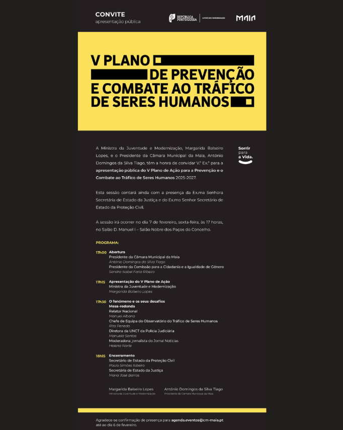 A Plataforma Portuguesa para os Direitos das Mulheres (PpDM) estará presente na apresentação pública do V Plano de Ação para a Prevenção e o Combate ao Tráfico de Seres Humanos 2025-2027, a ter lugar a 7 fevereiro 2025, às 17h00, nos Paços do Concelho da Câmara Municipal da Maia. A PpDM será representada pela Técnica de Projetos, Comunicação e Campanhas, Diana Pinto.