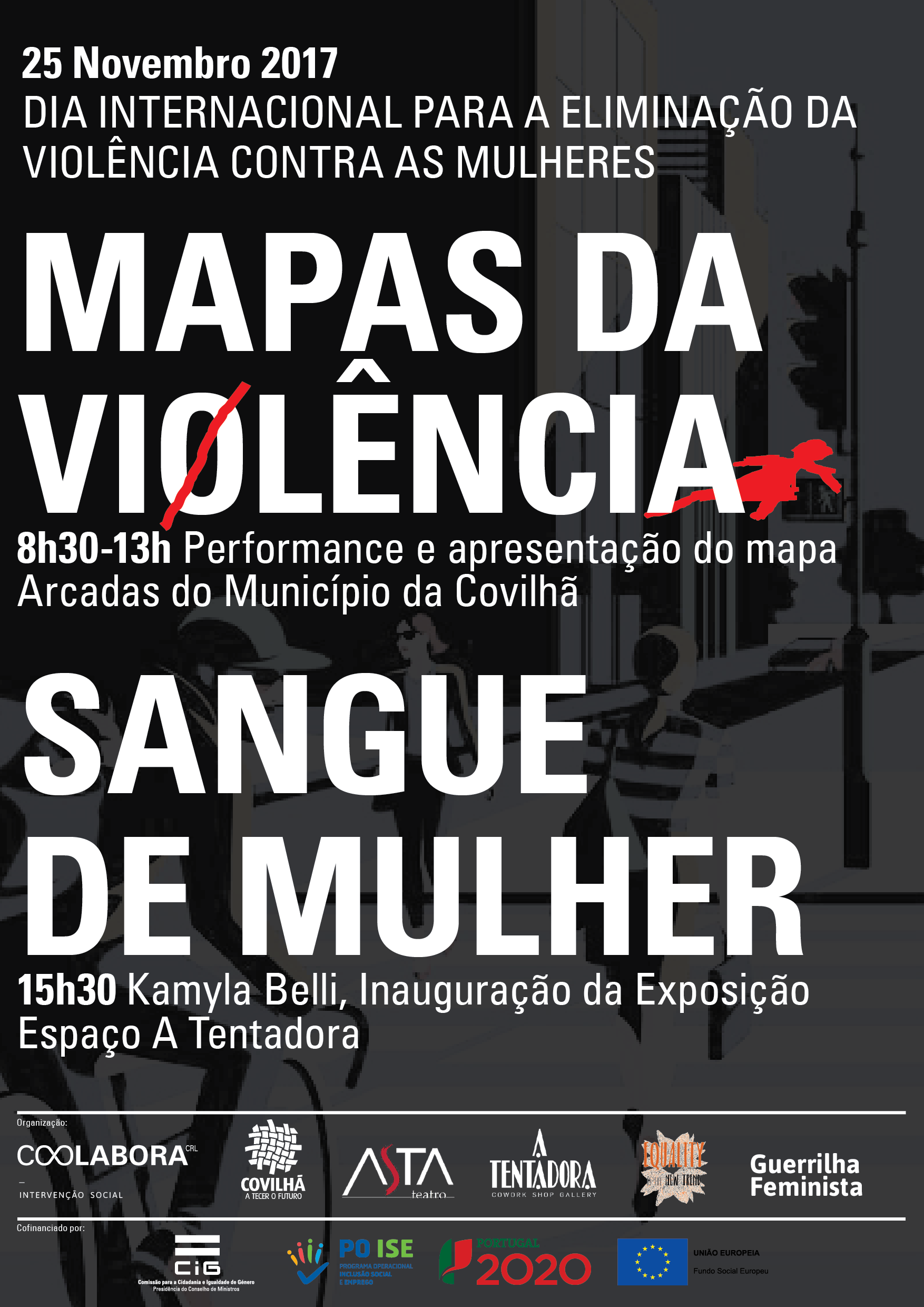 Na manhã do dia 25 de Novembro, a partir das 8h30, a cidade acordará com as ruas a contarem histórias. Podem seguir-lhes o rasto online ou ir até à Praça do Município, nas arcadas do edifício da Câmara, onde, durante toda a manhã, estará um estendal e um mapa onde estão inscritas histórias da violência. Às 15h30, Kamyla Belli inaugura a exposição “Sangue de Mulher”, na galeria d’A Tentadora .