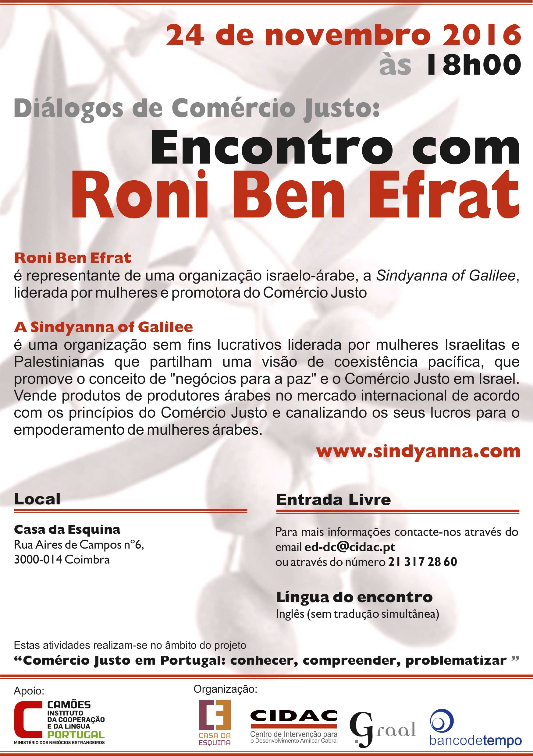 O Graal, em colaboração com o CIDAC e a Casa da Esquina, acolhem em Coimbra Roni Ben Efrat, representante da organização israelo-árabe, Sindyanna of Galilee, liderada por mulheres e promotora do Comércio Justo. O encontro será na Casa da Esquina, dia 24 de novembro, pelas 18h!