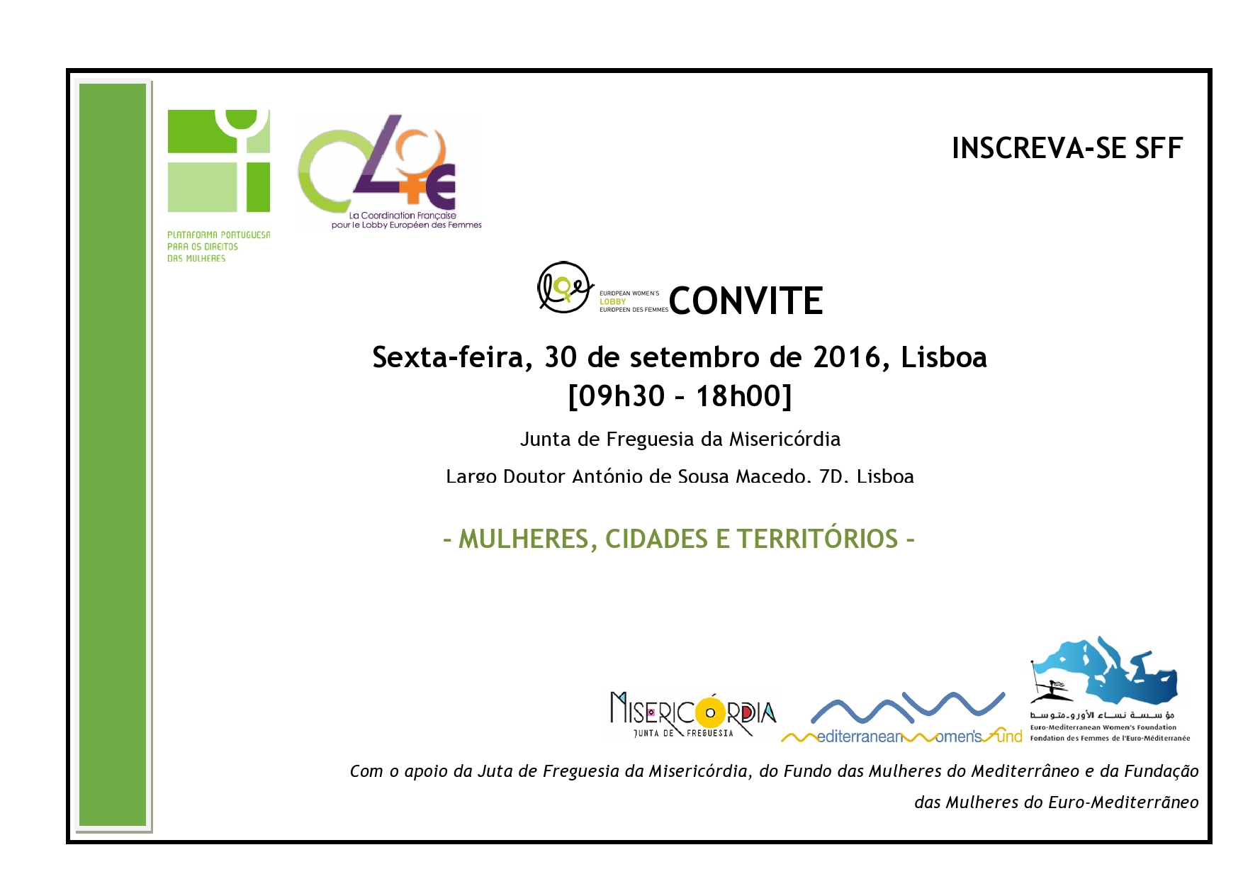 A Plataforma Portuguesa para os Direitos das Mulheres e a Coordenação Francesa do Lobby Europeu das Mulheres convidam para o seminário Mulheres, cidades e territórios. O Seminário visa aprofundar o conhecimento e as práticas de promoção das mulheres nas cidades, territórios e espaços públicos num momento em que as Nações Unidas discutem a nova agenda urbana para os próximos 20 anos HABITAT III.