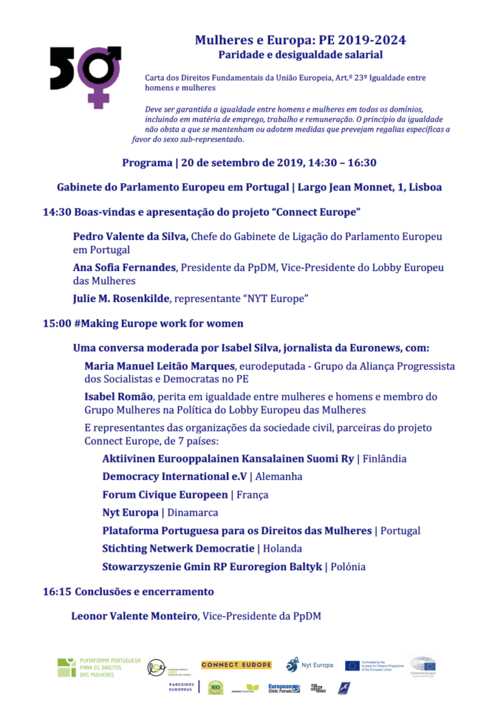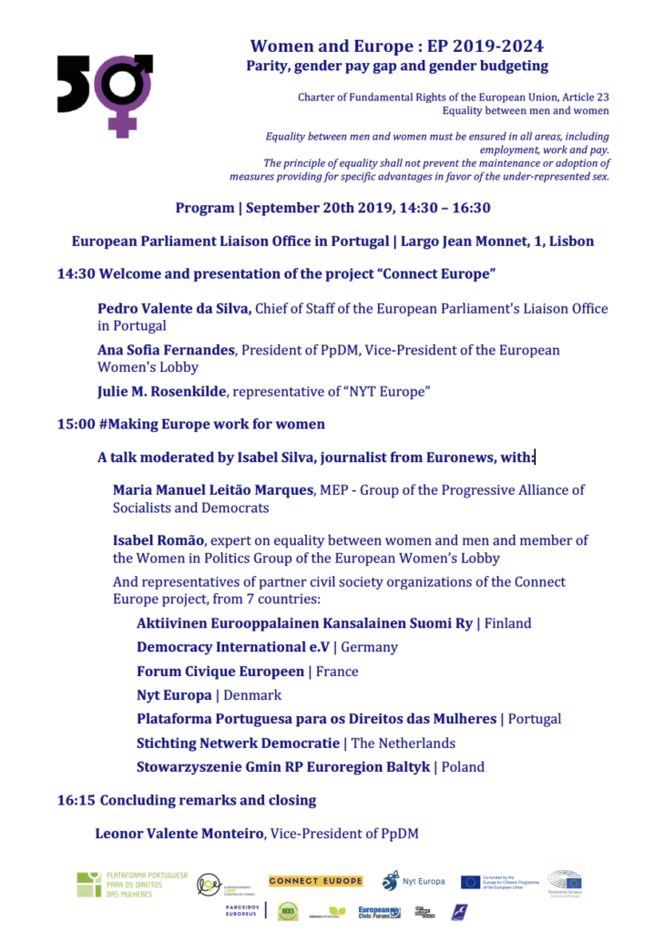 Uma conversa moderada pela jornalista da Euronews, Isabel Silva, com a eurodeputada Maria Manuel Leitão Marques e Isabel Romão, perita em igualdade entre mulheres e homens e membro do Grupo Mulheres na Política do Lobby Europeu das Mulheres. Conta ainda com a participação das organizações parceiras do projeto “Connect Europe” que visa envolver as cidadãs e cidadãos de 7 países europeus num diálogo construtivo sobre o futuro da Europa e apoiar as várias agendas e valores da UE. O projecto é co-financiado pelo Programa Europa para os Cidadãos da União Europeia e concebido para aumentar a cooperação transnacional na UE.